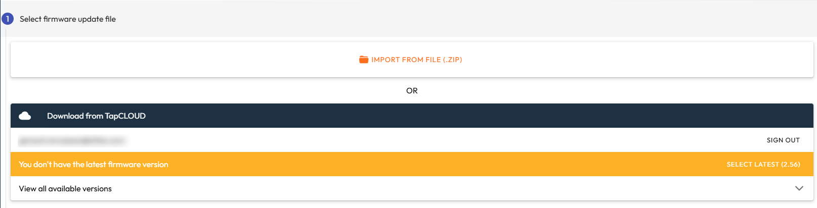 Click on Select latest to select the latest firmware version. You may also expand the version list to select any specific version compatible with your Tap that you wish to apply