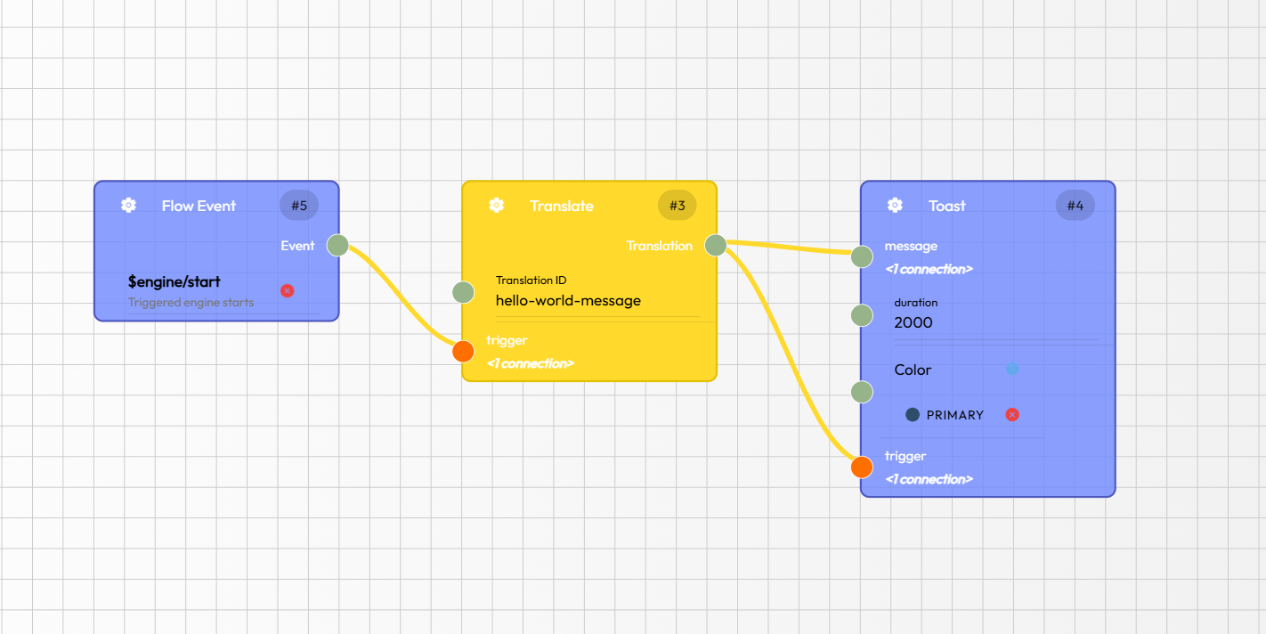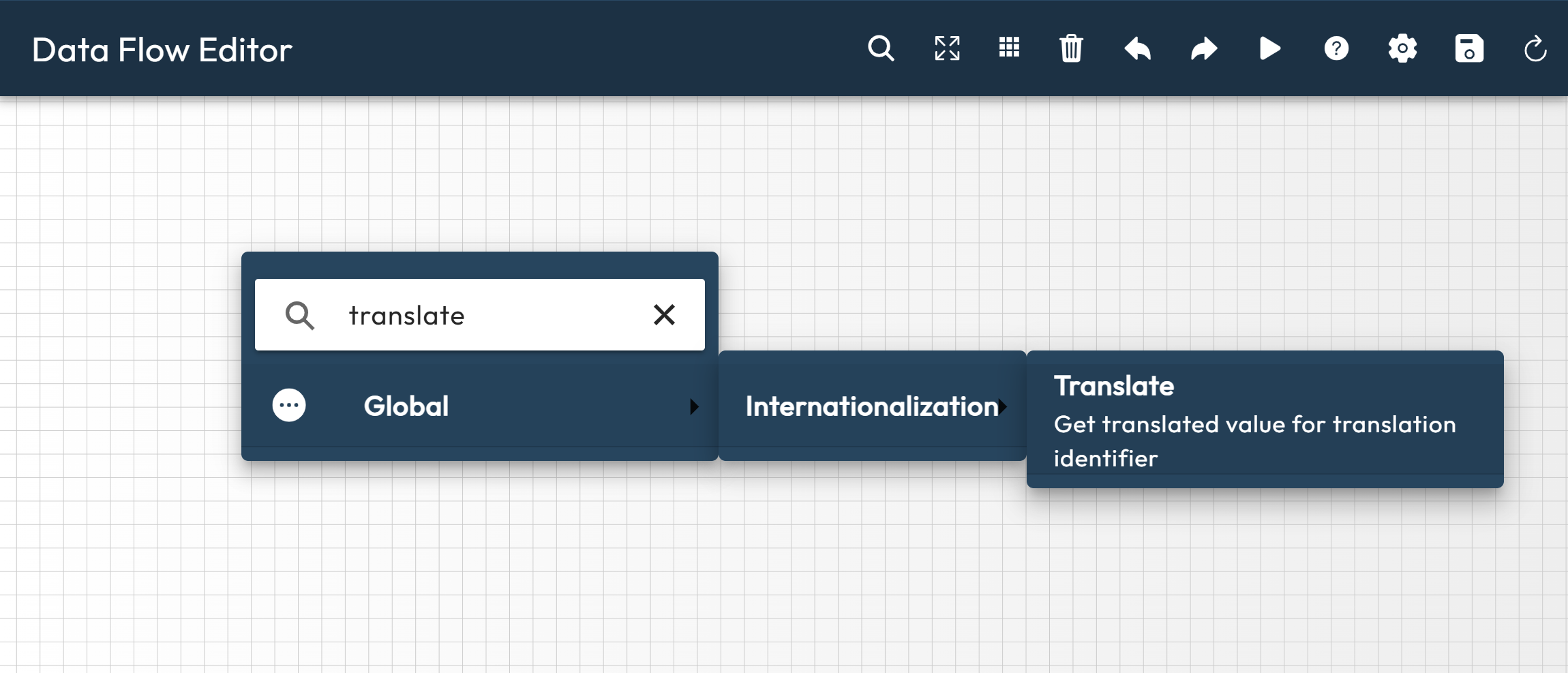 Output of the Translate node will be the translation according to the current language and the provided Translation ID. If the Translation ID does not exist, the translation result value will be the Translation ID itself.