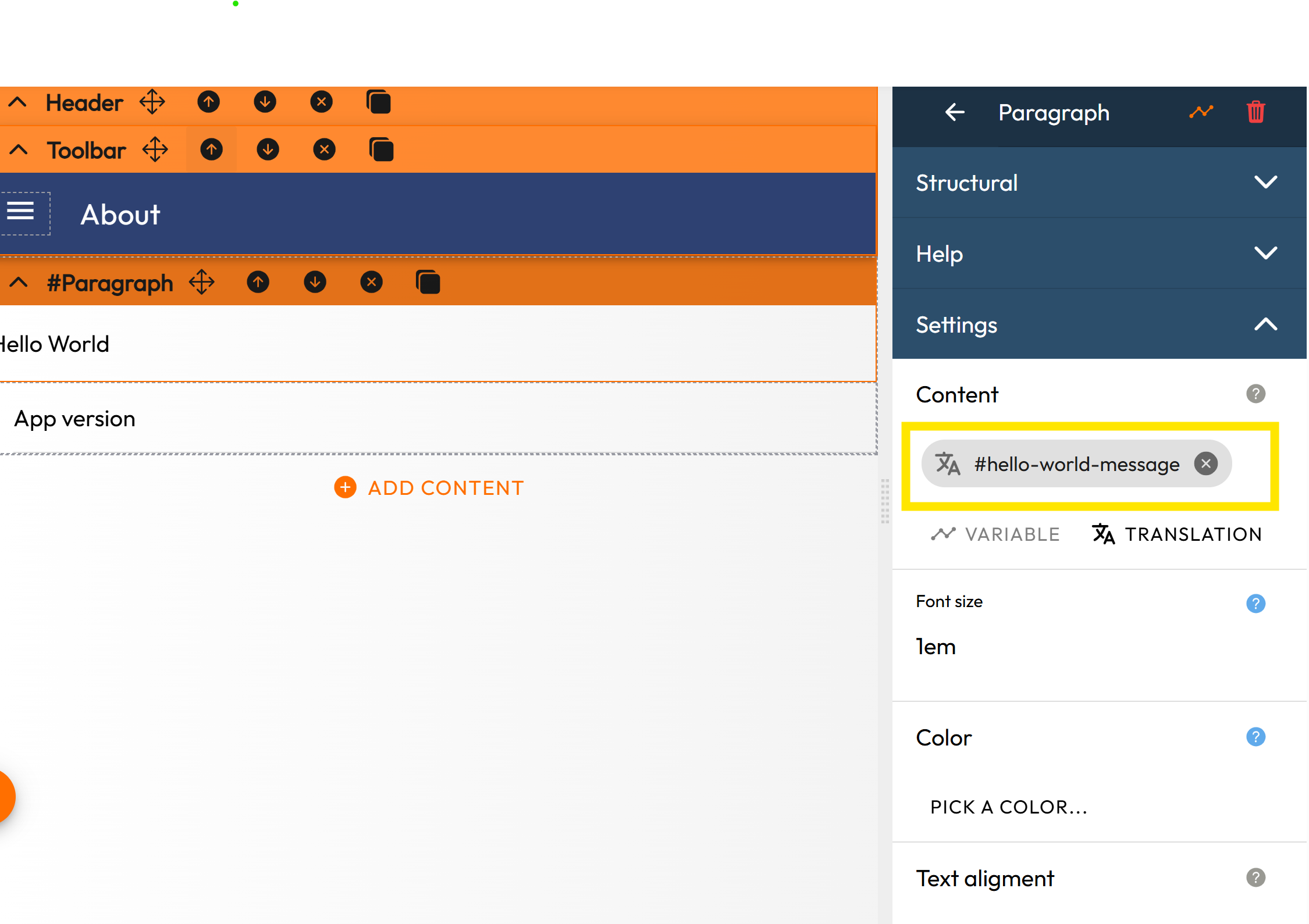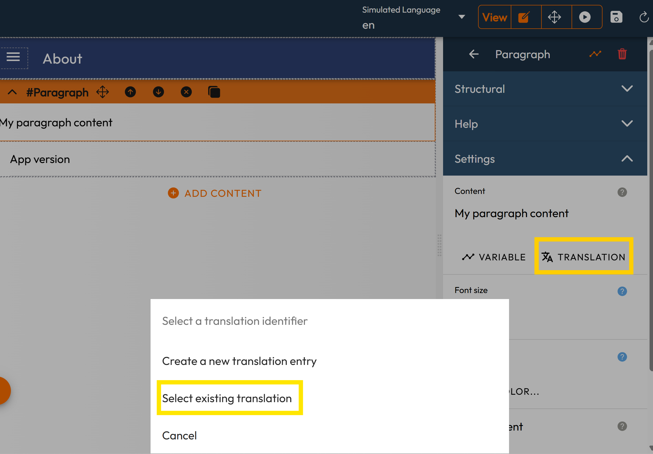 Open a Page UI editor and select the UI component where you want to add the translation. Select the settings that should be translated using the Translate button. If there is not Translate button, it means that it cannot be supported. Usually for settings that are not text.