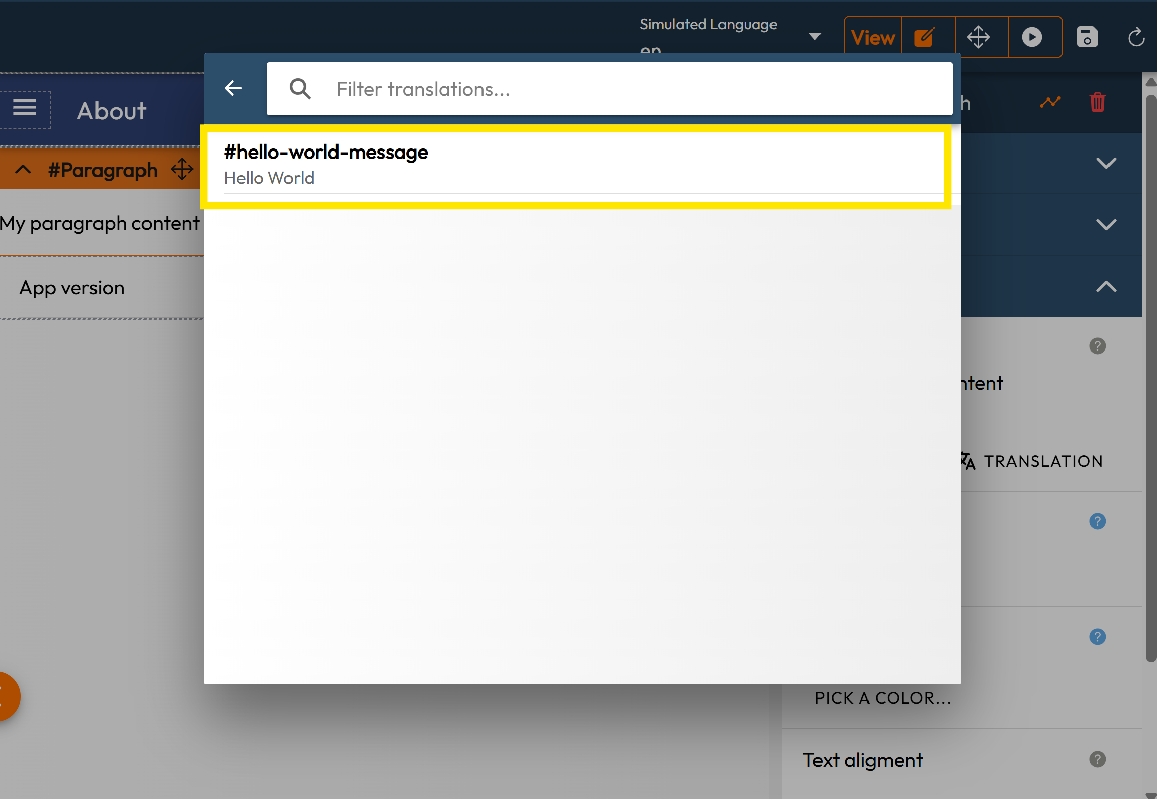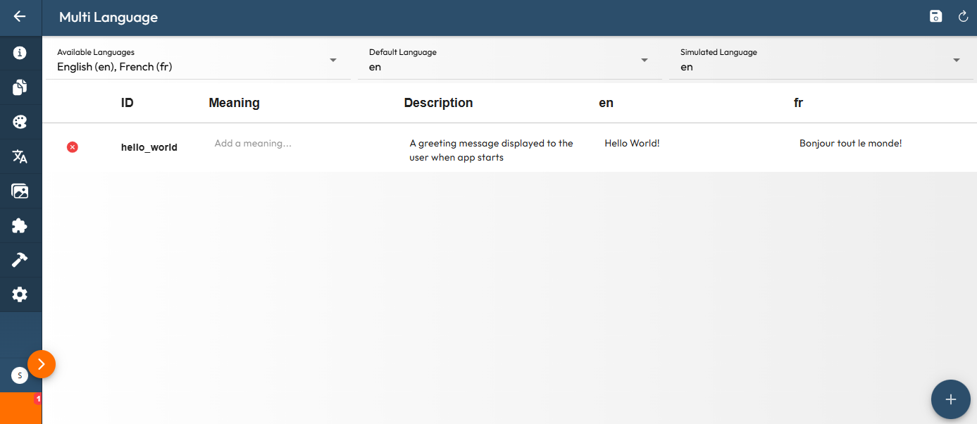 Simulated Language: Allows users to simulate how the application will appear in a selected language. It's only used during app development. End users will not see the simulated language.