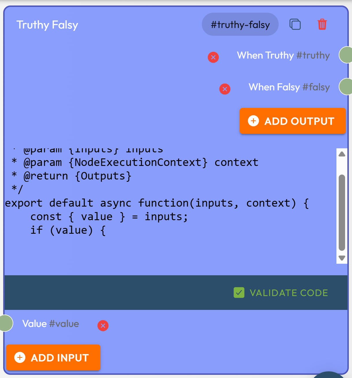 - If the returned object does not contain an output key, it will not trigger the connection for this output key (see below the Truthy/Falsy example).