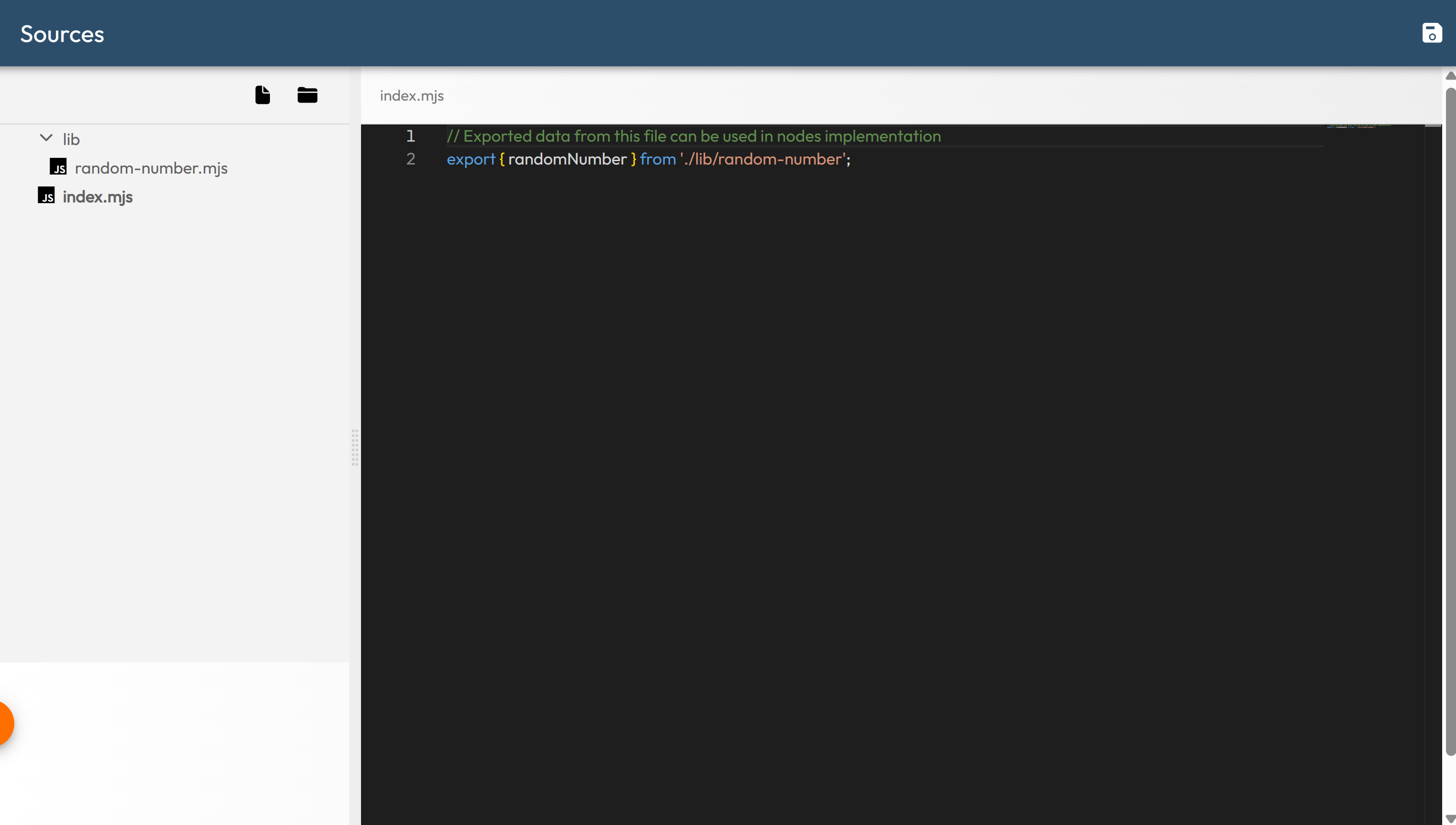 The source editor allows you to write JavaScript modules that you can use in your node's implementation. This allows you to share code that you can reuse in different nodes such as configuration values or shared functions.