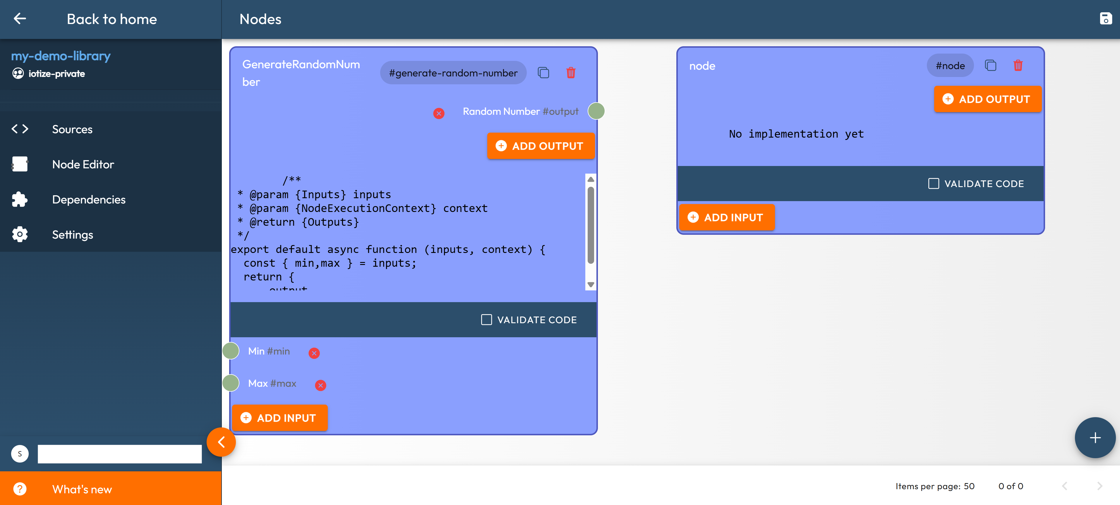 Click on the node implementation source code to open the code editor. This code corresponds to a JavaScript module that adheres to the following rules:
